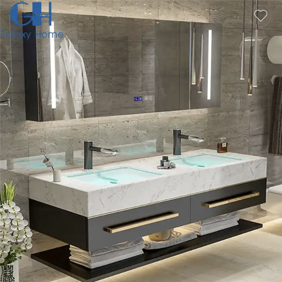 The Fontana Double Sink Bathroom Furniture Vanity Cabinet Smart Defogging Mirror brings both style and practicality to any bathroom space. This set showcases a vanity cabinet constructed from high-quality wood, ensuring durability and a timeless aesthetic. Notably, there has been a notable 200% increase in grades. The countertop features an 8cm thickness, employing a German 45-degree splicing technique, and its width extends to 55 cm on each side. The framework itself is robust. Enhancing its practicality, the solid wood cabinet boasts a 30% increase in storage capacity, a longer and larger drawer, and a bottom storage board with a thicker design. The metal handle has been lengthened for ergonomic functionality. Exceptionally crafted ceramic pots of 3A-grade quality undergo high-temperature firing at 1300 degrees, resulting in enduring brilliance. The Fontana Double Sink Bathroom Furniture Vanity Cabinet Smart Defogging Mirror stability, security, and trustworthiness of the cabinet are reinforced by the double-layer structure breaker. Perfectly suited for busy households or shared bathrooms, the double sink design offers comfort for multiple users simultaneously. The seamless integration of sinks with the countertops bestows a sleek, contemporary appearance. A standout feature of this vanity cabinet set is the intelligent defogging mirror. Equipped with cutting-edge technology, this mirror remains clear even in hot bathroom environments, eliminating the need for manual condensation wiping post showers or baths, thus saving time. The Fontana Double Sink Bathroom Furniture Vanity Cabinet Smart Defogging Mirror comprises a wood vanity cabinet that generously accommodates bathroom essentials such as towels, toiletries, and cleaning supplies. The cabinet is equipped with ample storage space, featuring cabinets and drawers with sturdy handles for easy access and organization. Overall, the vanity cabinet set boasts a sleek and modern aesthetic, making it a versatile choice that complements a range of bathroom design themes, whether modern, traditional, or transitional. The Fontana Double Sink Bathroom Furniture Vanity Cabinet Smart Defogging Mirror is poised to elevate the visual appeal of your bathroom while providing essential functionality.