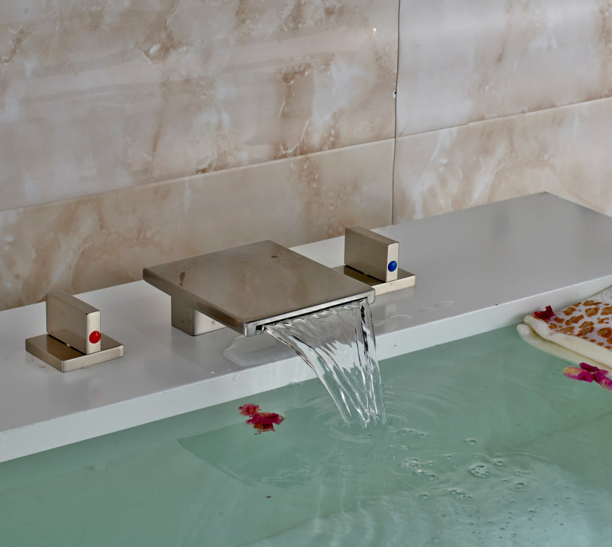 Brushed bathroom sink faucet three handle deck mount waterfall